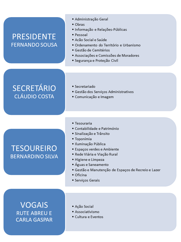 Este quadro mostra as diversas tarefas e competências atribuídas pelo Presidente do Executivo, de acordo com a Lei n.º 75/2013 de 12 de Setembro, aos membros da Junta de Freguesia, em reunião de 6 de Novembro de 2025: